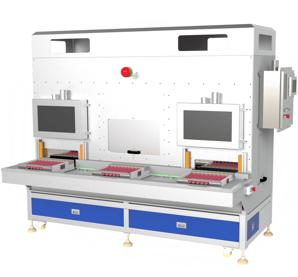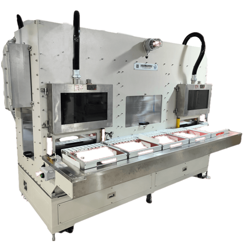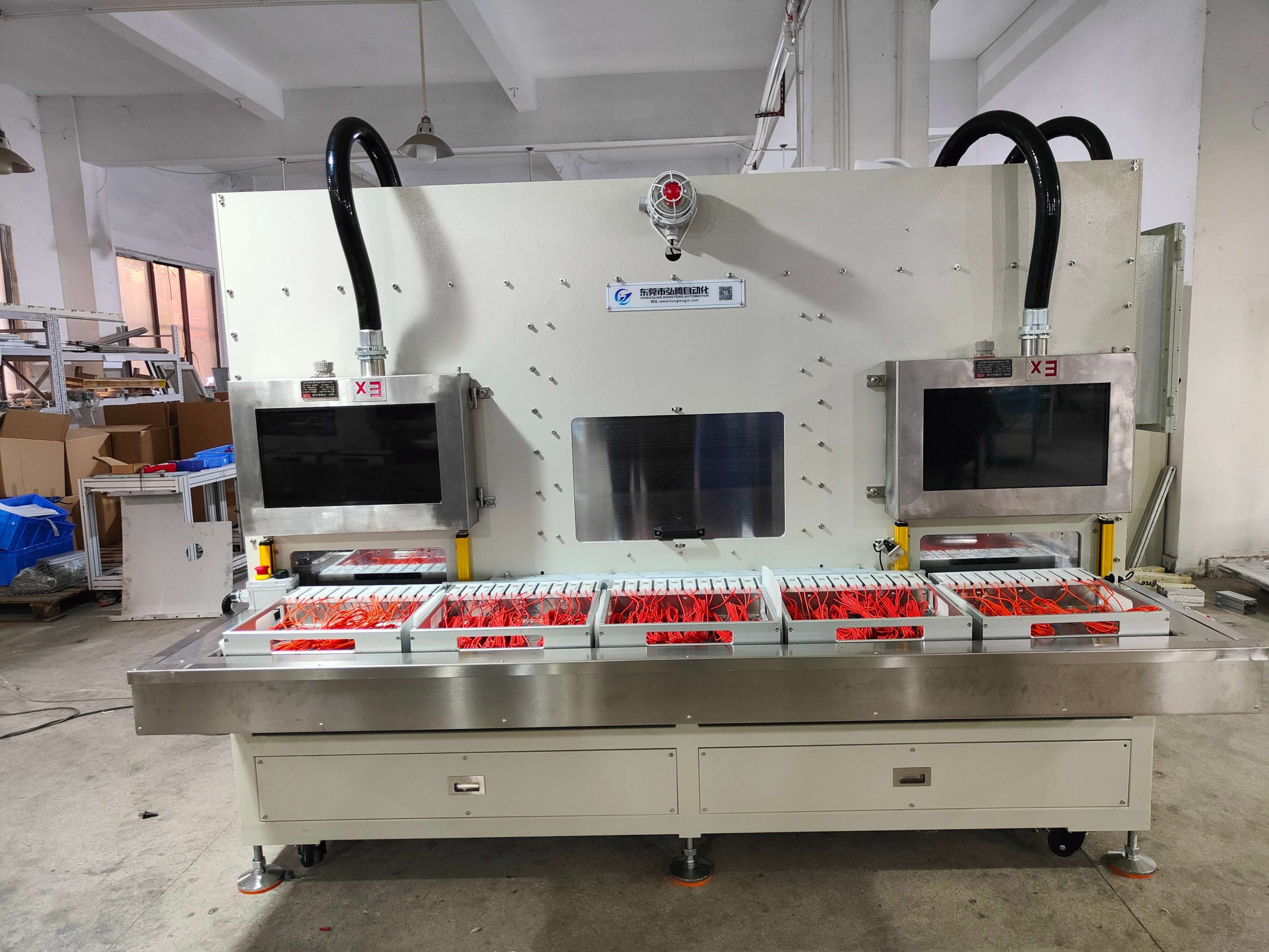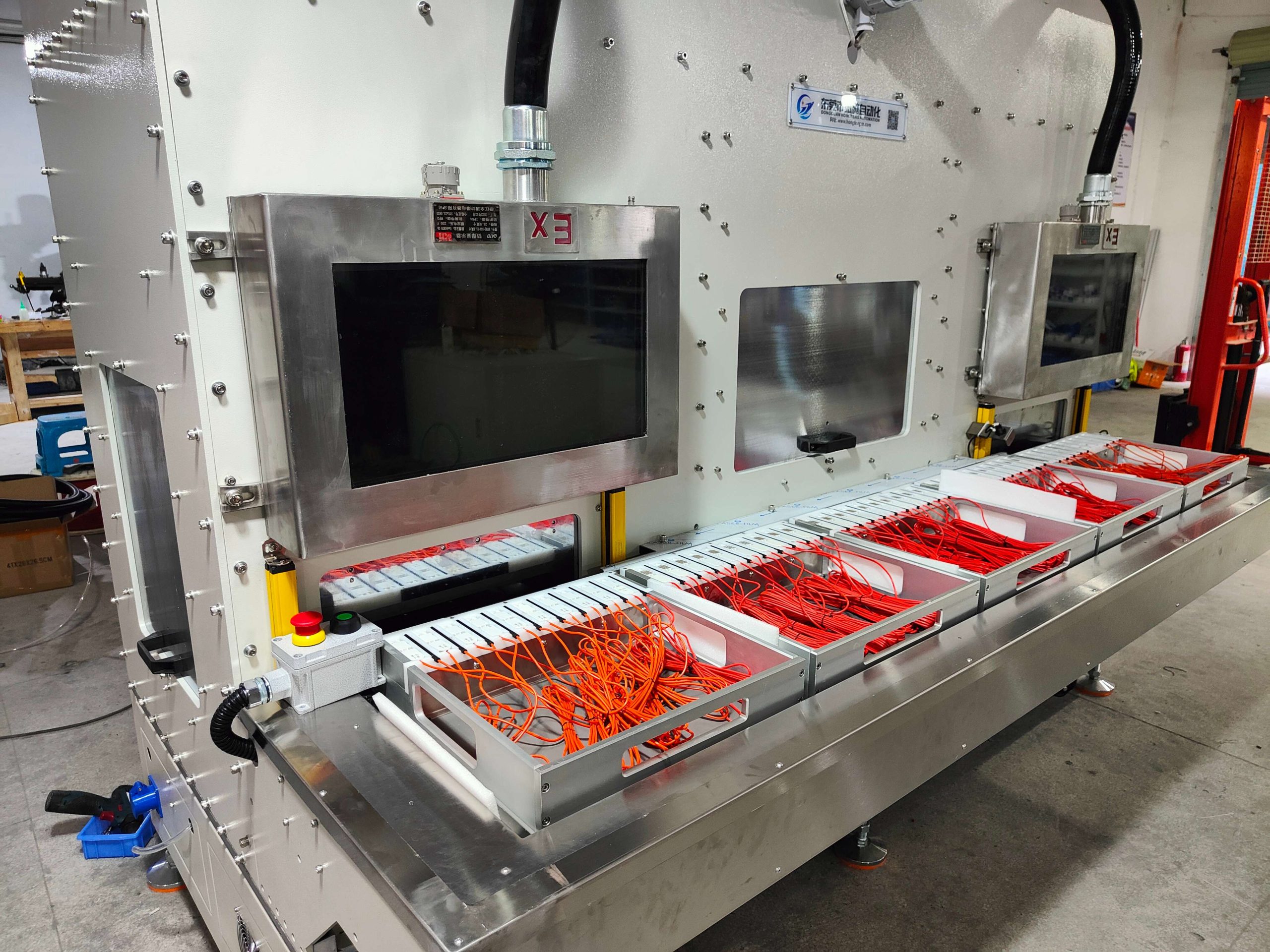 我公司自主研發(fā)的十發(fā)三碼綁定設(shè)備,設(shè)備可單次10發(fā)電子雷管同時進行三碼綁定,效率是普通三碼綁定設(shè)備的10倍,極大的提高的電子雷管三碼綁定的效率。該設(shè)備采用隔爆設(shè)計,所有危險工序全部在隔爆區(qū)域內(nèi)完成,工作人員不接觸危險工序,安全可靠。同時,設(shè)備內(nèi)部裝有高清防爆攝像頭,能夠?qū)崟r監(jiān)控隔爆間內(nèi)部情況,生產(chǎn)過程可實時查看。